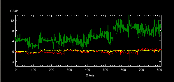 The plots below show rotational head movement during the concatenated fMRI scans of the experiment. These subjects were discarded because of continuous pitch (yes-yes) movements of the head during scanning. This motion was the result of padding on the sides of the head preventing yaw and roll movements, but no padding to the forehead to prevent pitch rotations. The X-axis is in units of TRs, and the Y-axis is rotation in degrees. The color code used is: